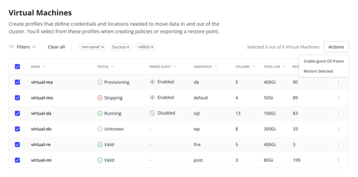 Restore points are now discrete for each VM, protecting only the resources needed for that VM. Restoring a single VM is as simple as selecting its restore point. Need to restore all VMs in a namespace, or across namespaces? The enhanced VM Dashboard also supports mass restore operations, making recovery fast and precise.