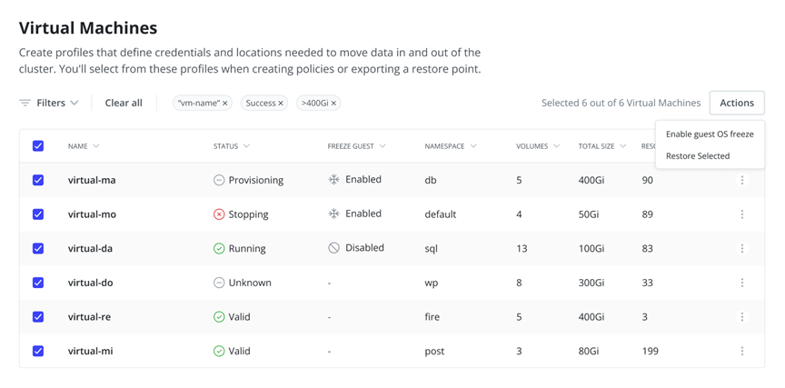 Restore points are now discrete for each VM, protecting only the resources needed for that VM. Restoring a single VM is as simple as selecting its restore point. Need to restore all VMs in a namespace, or across namespaces? The enhanced VM Dashboard also supports mass restore operations, making recovery fast and precise.