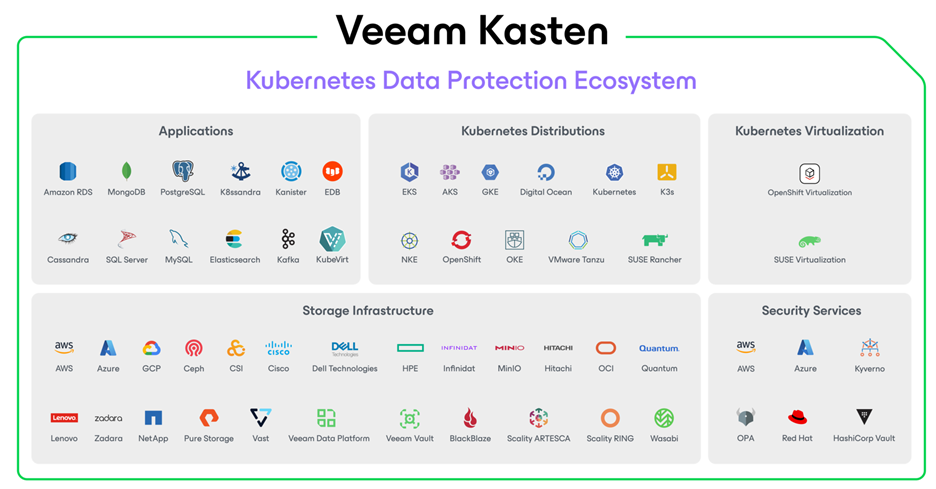 Veeam Kasten is the only Leader and Outperformer in the Kubernetes Data Protection market for the fifth year in a row, as tracked by GigaOm Radar. Our solution is trusted by banks, retailers, federal agencies, and public sector organizations, among many others, to protect both containers and KubeVirt VMs. These deployments reflect Veeam Kasten’s strong foundations in security, scale, and data freedom, all built in a Kubernetes-native manner and reinforced by deep technical integrations with partners like Red Hat, Microsoft, AWS, and SUSE.