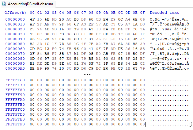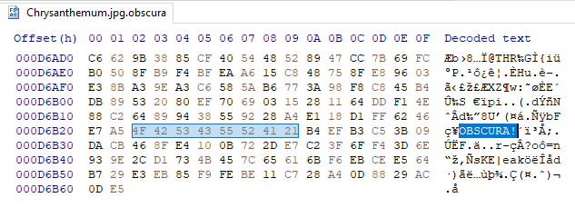 Here’s a sample of a small encrypted file. Note the filemarker “OBSCURA!” and the encrypted key saved to the end of the file.