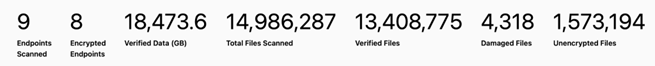 Note that Recon has found the missing footer and noted it as an invalid file marker. Recon is also able to summarize the total volume of files scanned, and the proportion that is verified as properly encrypted, damaged, and unencrypted. Coveware clients are given access to a portal that allows them to drill deeper into these results and view each schedule, down to the file level.