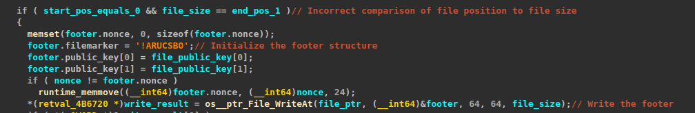 Reverse-engineering Obscura’s code confirms the issue: the malware only writes its footer if the file pointer reaches the physical end of the file.